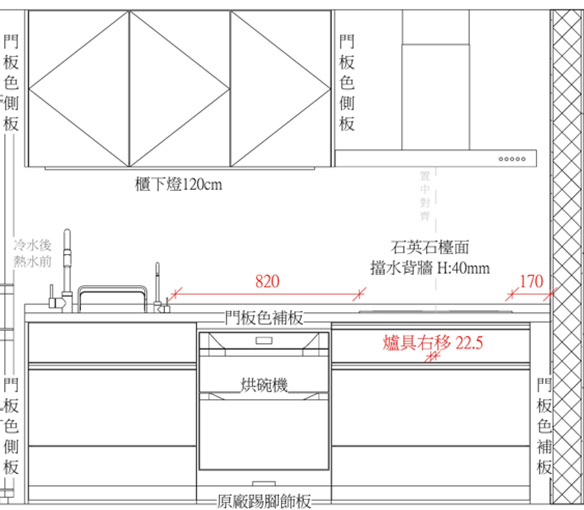 ◆ 尺寸樣式 : 一字型後排櫃 120cm+電器櫃 60cm+100cm冰箱上櫃