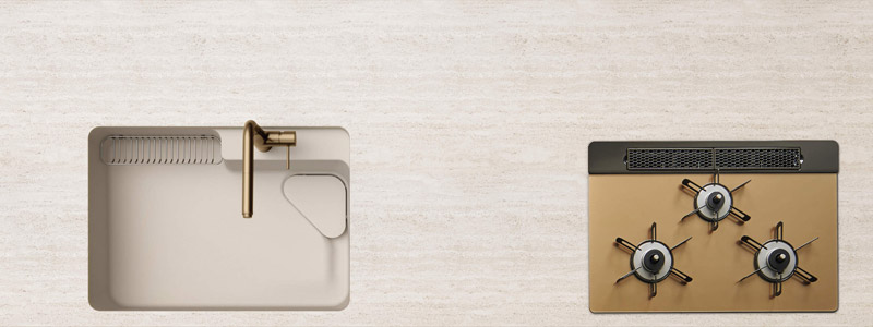 在經常使用的調理空間採用了特殊浮凸設計,減少餐具與檯面及水槽 接觸的面積,不易產生刮痕, 即使有刮痕也比較不明顯。