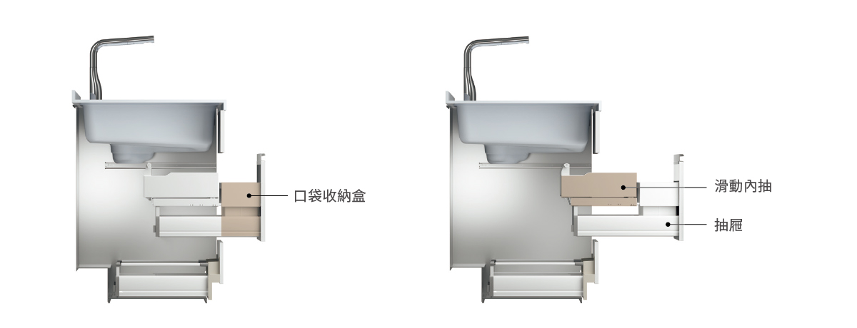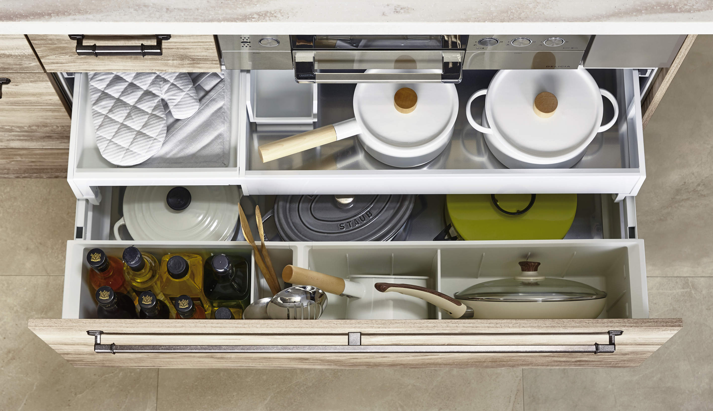 使用器具集中放在前側,抽屜採立體式設計,可更有效率地取用。